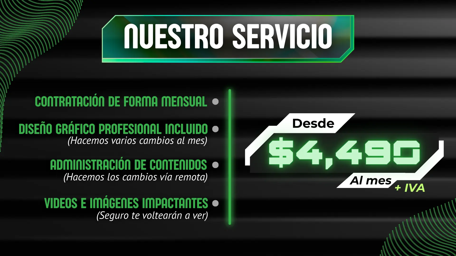 Renta mensual de pósters LED llave en mano: mándanos tu información por WhatsApp y nosotros nos encargamos de todo. Incluimos 5 horas mensuales de Diseño Gráfico Profesional, cambios de contenido de forma remota y contenido siempre actualizado para que tu negocio atraiga más clientes de forma orgánica.
